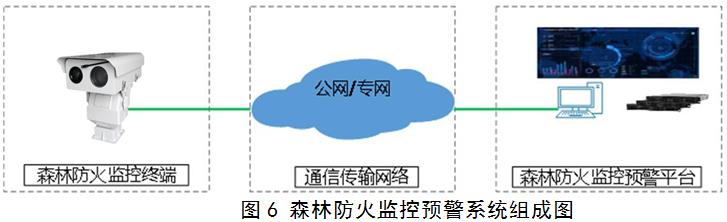 森林防火監(jiān)控預(yù)警系統(tǒng)主要由森林防火監(jiān)控終端、通信傳輸網(wǎng)絡(luò)、森林防火監(jiān)控預(yù)警平臺組成。